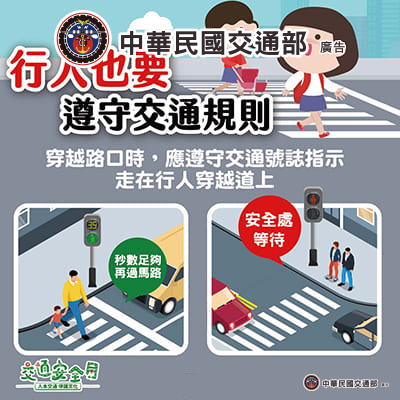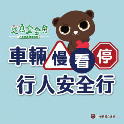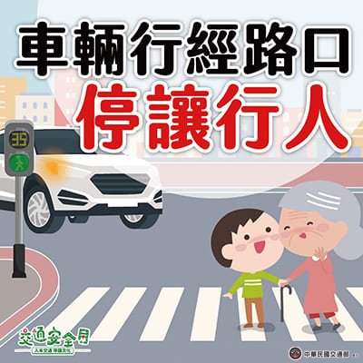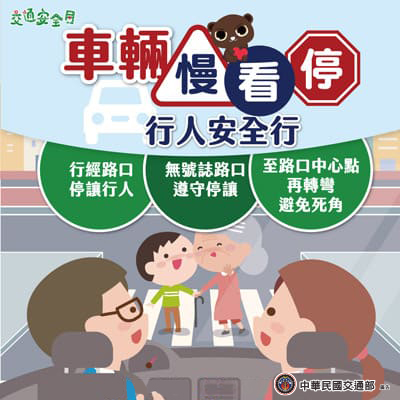 交通部自109年起推動全國交通安全運動,並訂定9月為交通安全月,114年主題為「人本交通-停讓文化」,口號為「車輛慢看停 行人安全行」。